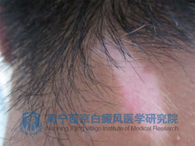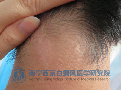 患者韦佳佳一年前有一次因在理发店理发时发现后颈部有小块白色斑点,当时经过理发师提醒后,并没有注意。但是,由于近期发现白斑有所扩大,患者担心白斑会扩散到脸上,影响自己的容貌,进而来我院治疗。由于先前没有使用过其他药物治疗,也没有其他病史。所以,在我院检查确诊后,肖海靖主任为患者采用了药离子渗透疗法和黑色素细胞培植术进行治疗。通过这两种方法的内调外治,患者后颈部的白斑很快好转。